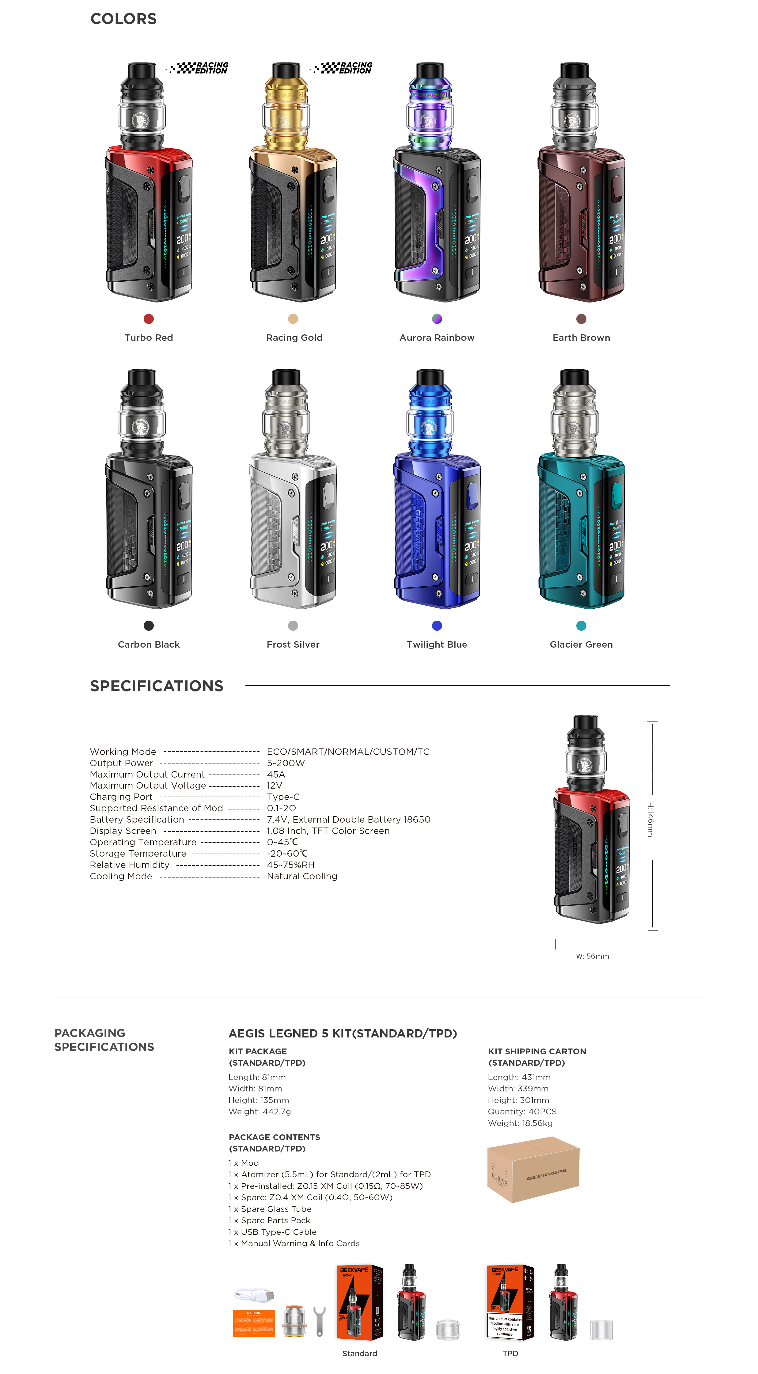 Découvrez le kit Aegis Legend 5 de Geekvape : une box robuste et puissante de 5 à 200W. Elle propose 5 modes d’utilisation (ECO, SMART, NORMAL, CUSTOM, TC) pour s’adapter à vos préférences. Fonctionne avec deux accus 18650 (non fournis) et dispose d’un écran couleur TFT 1.08". Associée au clearomiseur Zeus Subohm de 5 ml, elle garantit vapeur dense et saveurs intenses.