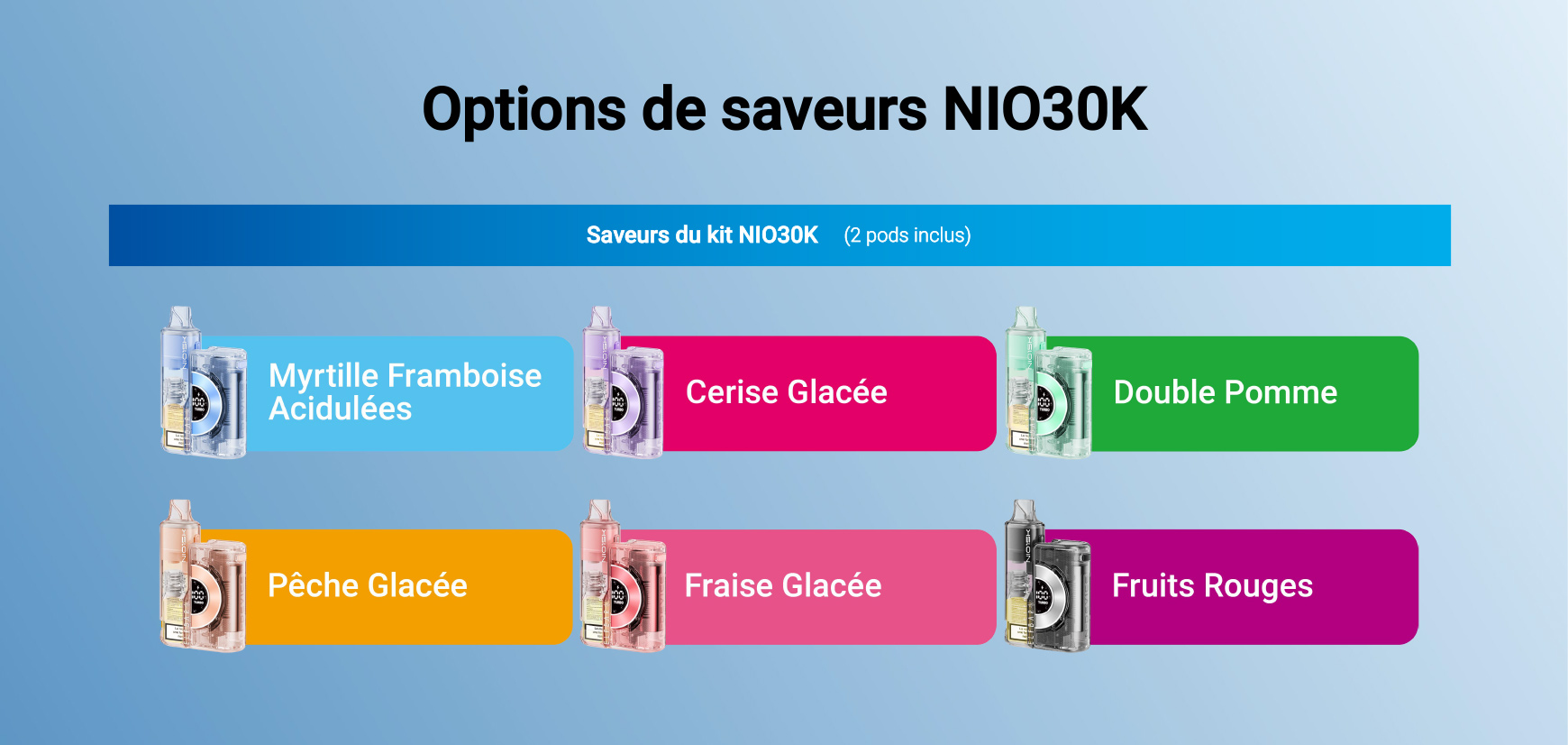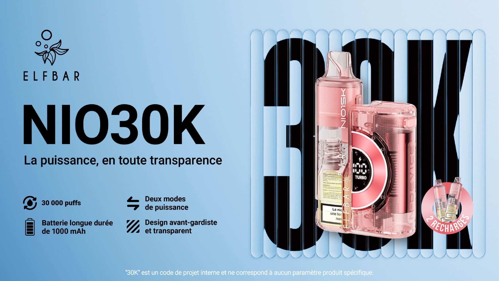 Découvrez l'Elfbar NIO 30K : un appareil réutilisable au design transparent et moderne. Doté d’une batterie puissante de 1000 mAh, il offre deux modes de puissance pour une expérience sur mesure.