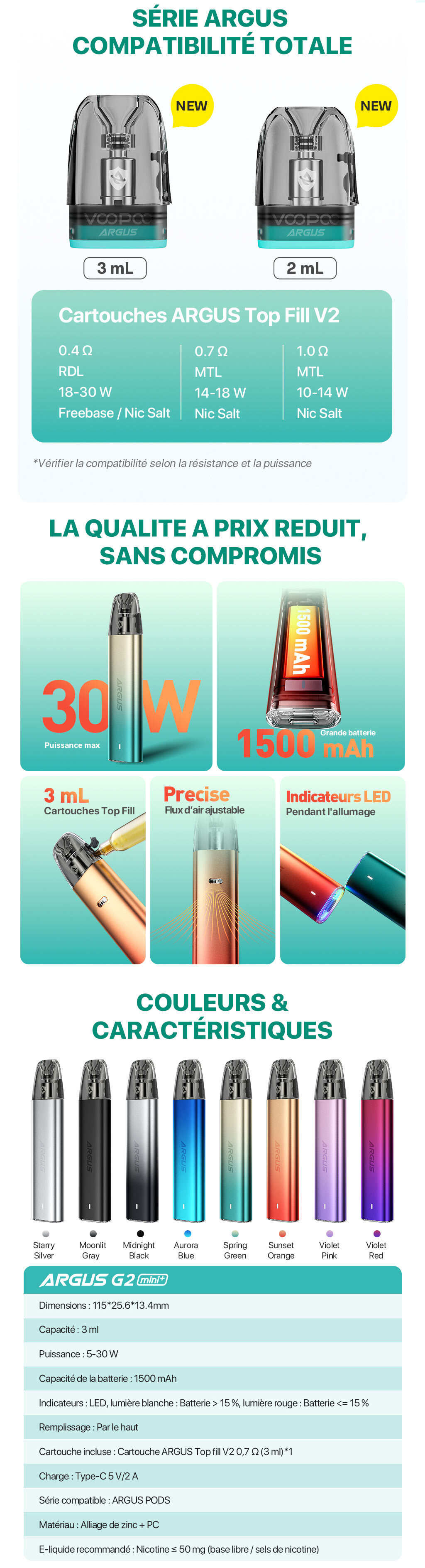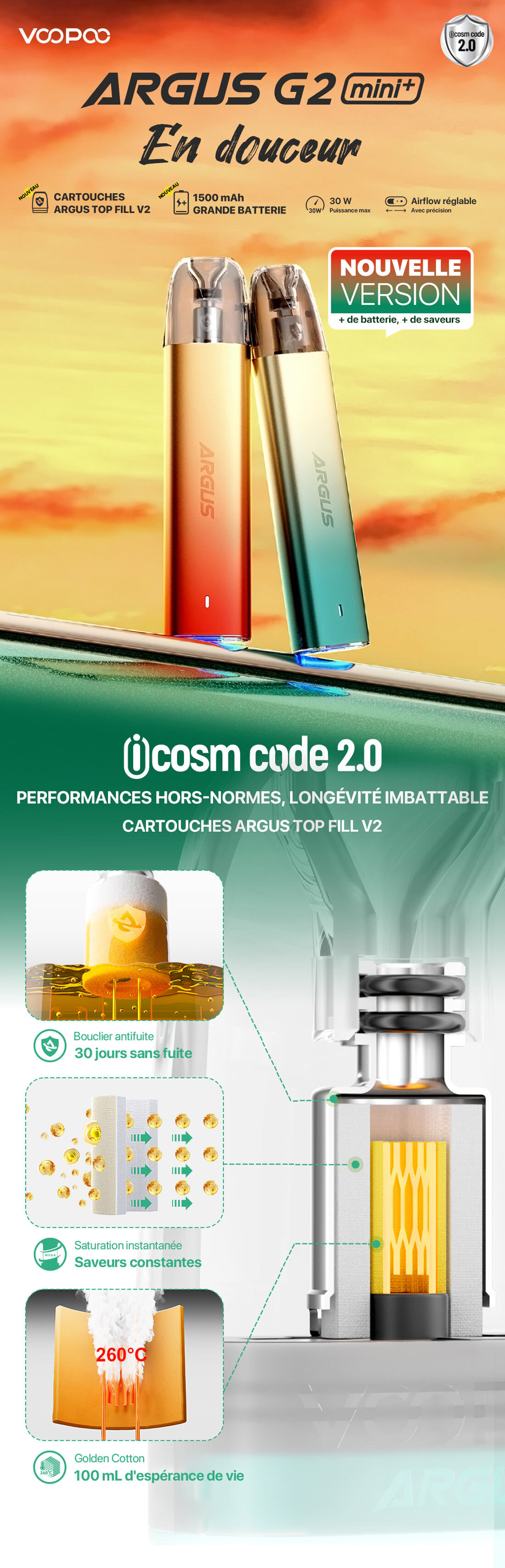 Découvrez l'ARGUS G2 mini+ de Voopoo : une puissance impressionnante dans un format compact grâce à sa batterie haute densité de 1500mAh. Profitez de 30 jours d'utilisation avec jusqu'à 100mL de saveur constante. Son réservoir ARGUS V2 à remplissage facile par le haut et son débit d’air ajustable offrent une expérience personnalisée et pratique au quotidien.