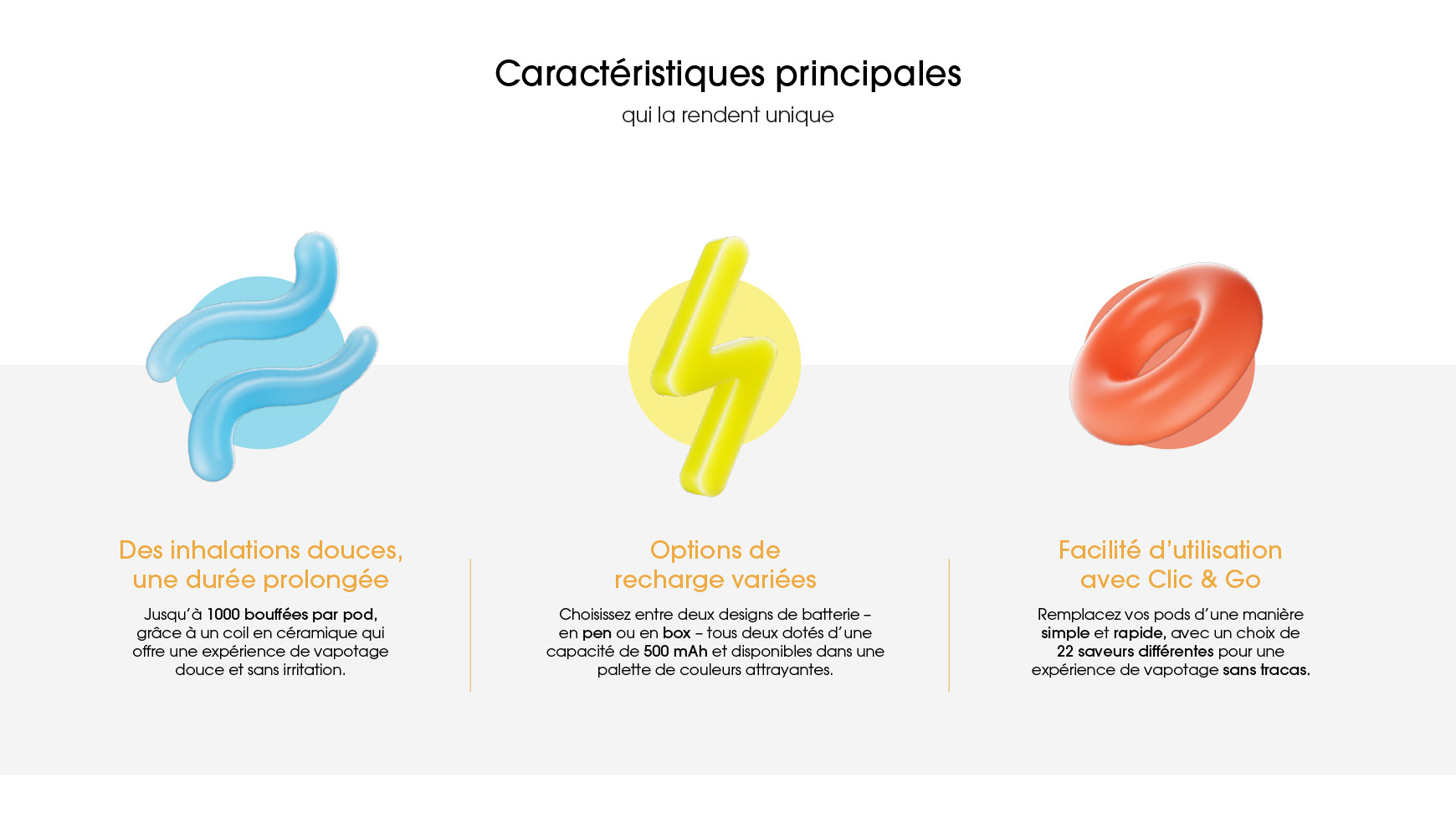 Le système de code couleur permet d’identifier instantanément la saveur de chaque cartouche. Il suffit de retirer les capuchons de protection (haut et bas), d’insérer la cartouche dans le pod, et le tour est joué. Aucun remplissage ou remplacement de résistance à prévoir : une fois vide, on jette, on remplace.