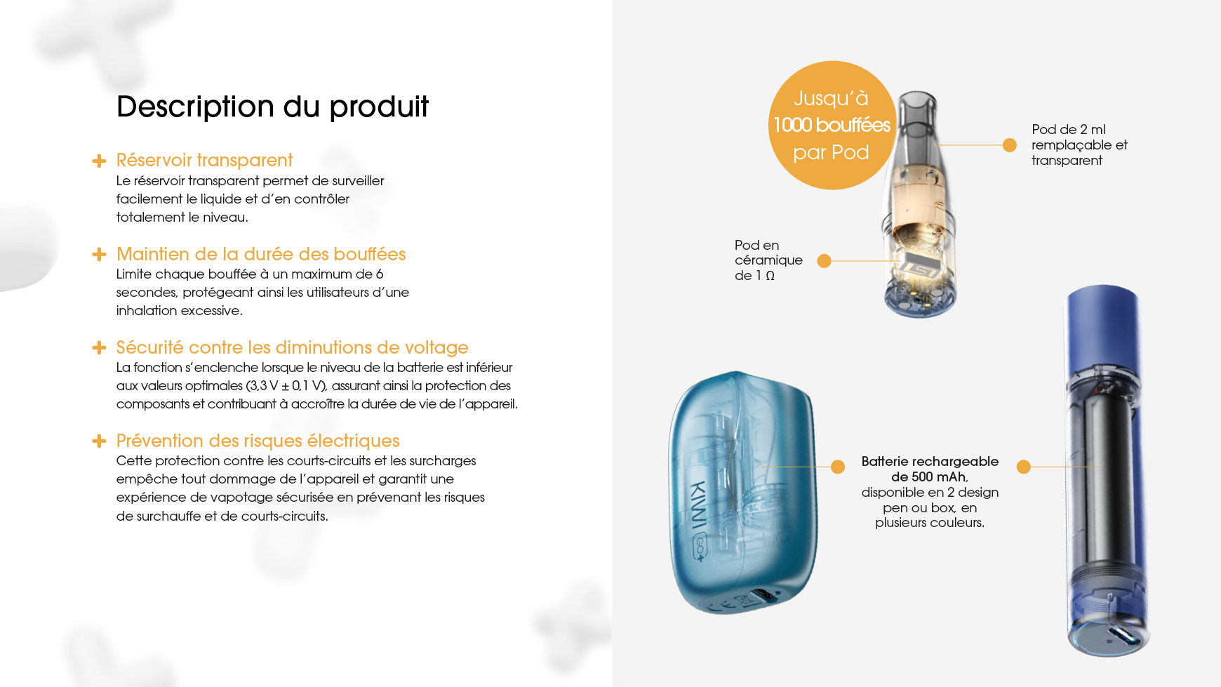 Aucune surprise ici : le Mini utilise les mêmes cartouches que le KIWI Go+. Chaque réservoir pré-rempli de 2 ml contient une résistance en céramique de 1 ohm scellée. 14 saveurs sont déjà disponibles, avec 8 autres en cours de lancement.