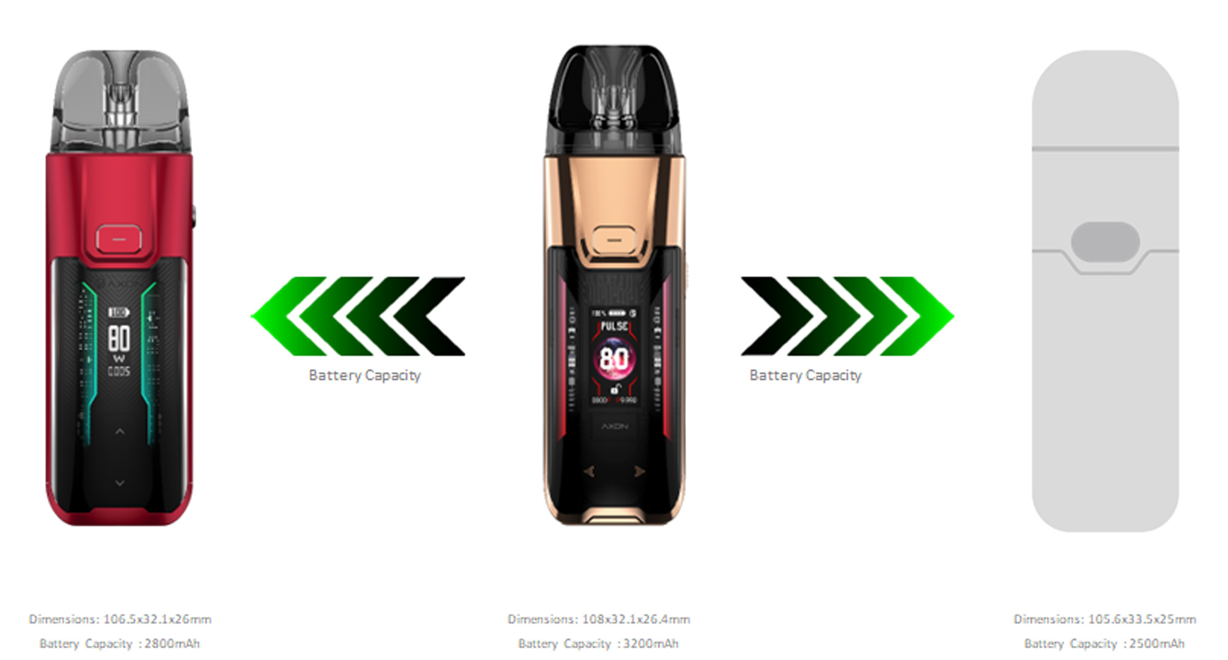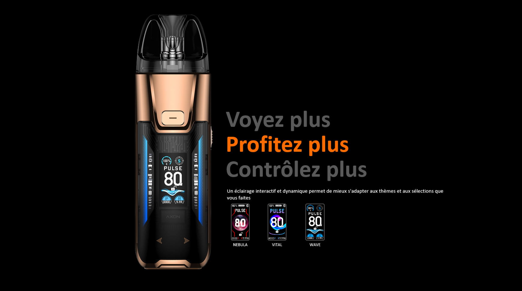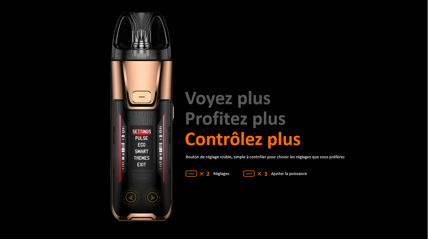 La MEGA BATT de 3200 mAh améliorée, associée au MODE PULSE de la PUCE AXON ralentit la dégradation des saveurs, optimisant la préservation de la saveur par rapport au nombre de bouffées.