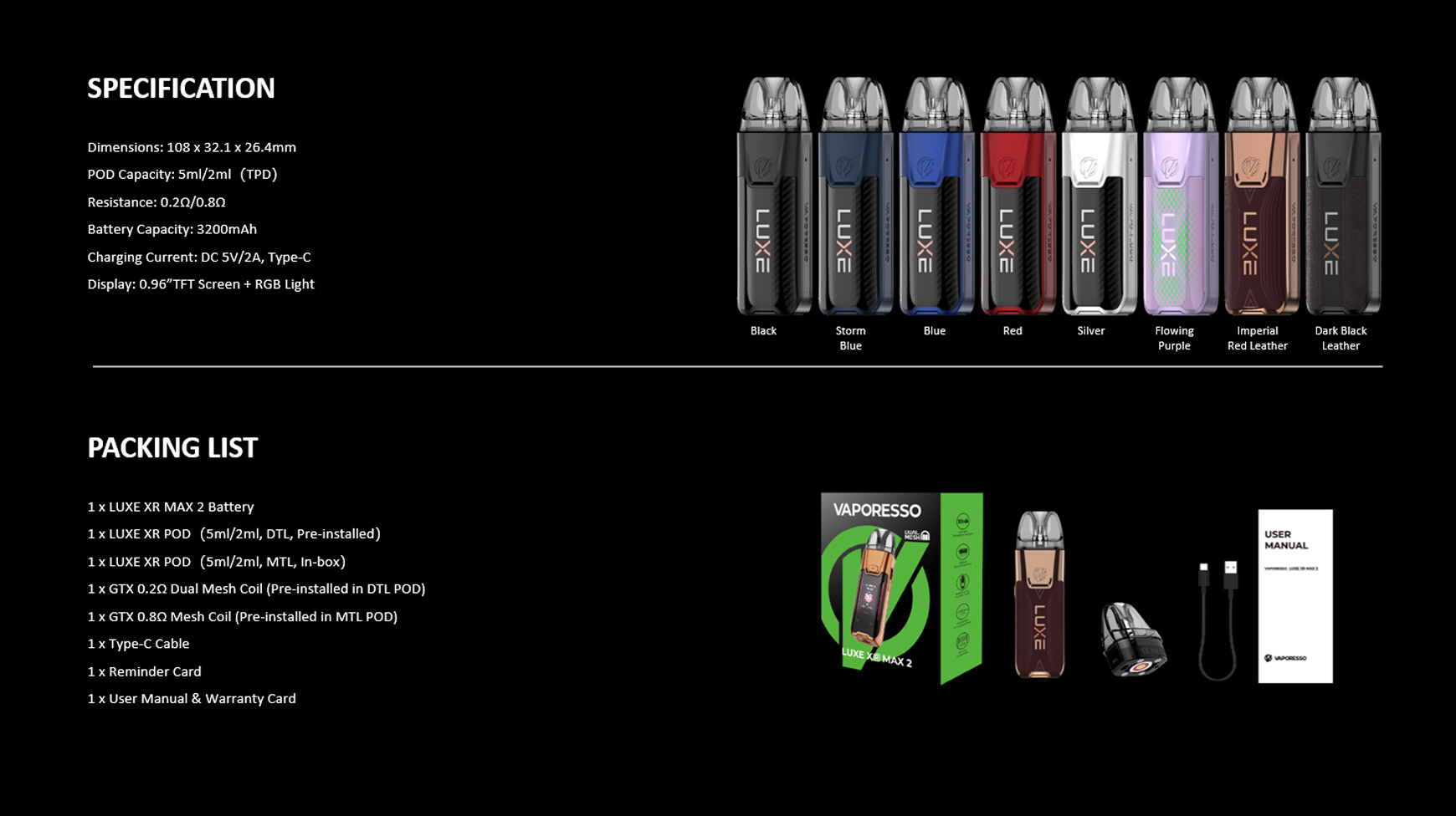 La LUXE XR MAX 2 continue d'utiliser la technologie MEGA BATT, offrant une batterie ultra haute densité de 3200 mAh. Elle délivre 14 % de puissance supplémentaire par rapport à LUXE XR MAX sans en augmenter la taille, augmentant l'autonomie tout en préservant une taille compacte.