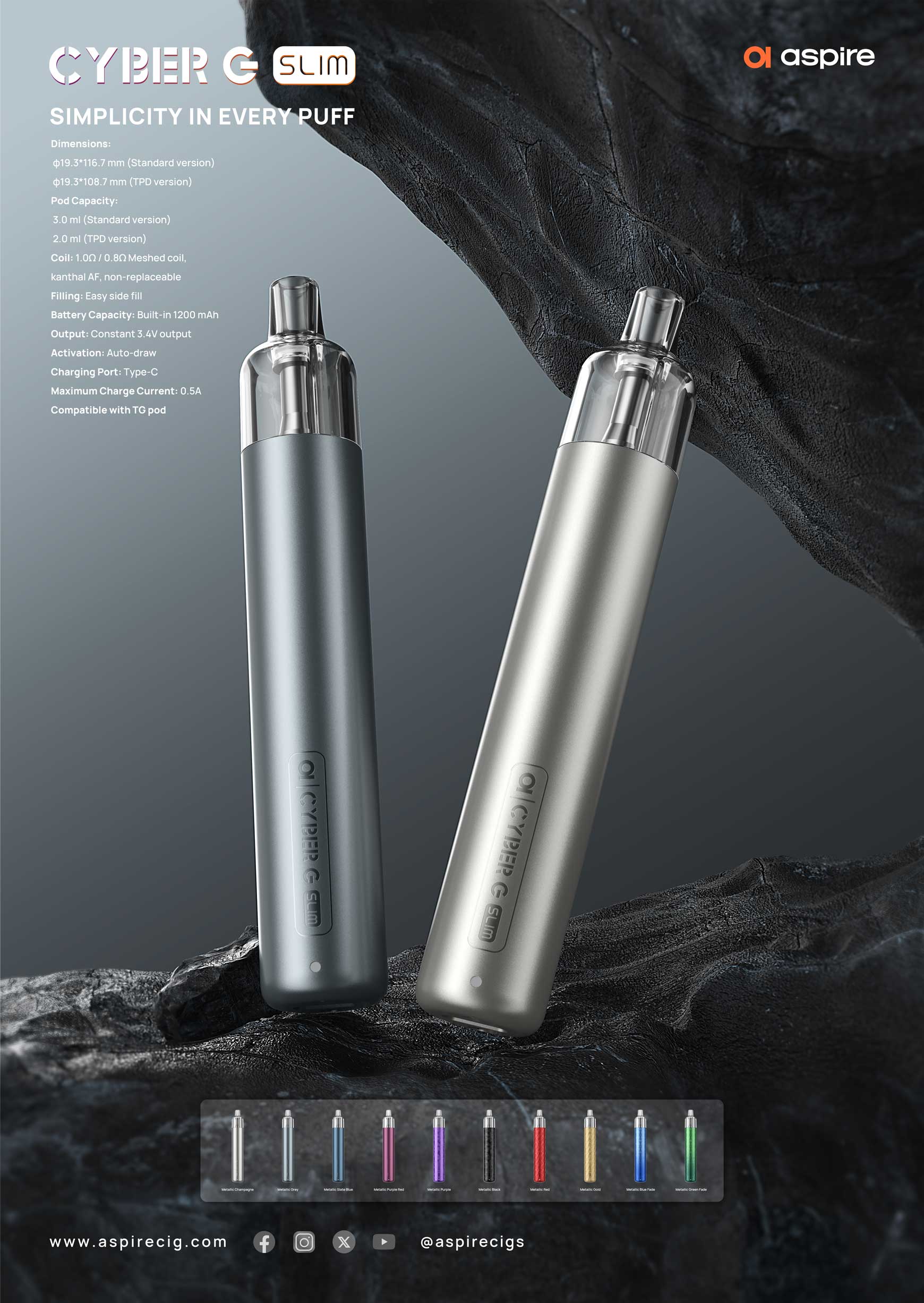 Le Cyber G Slim Metal Classic Edition d’Aspire est un pod ultra‑compact (116,7 × 19,3 mm, ∼40 g) au design métallique élégant. Il embarque une batterie intégrée de 1200mAh avec tirage entièrement automatique (auto‑draw), activation par inhalation et éclairage LED pour indiquer le niveau de charge. Compatible avec les cartouches Cyber G (TG Pods) de 3ml (résistances fixes 0,8 / 1,0 Ω), elles se remplissent facilement par le côté. Recharge rapide via USB‑C.