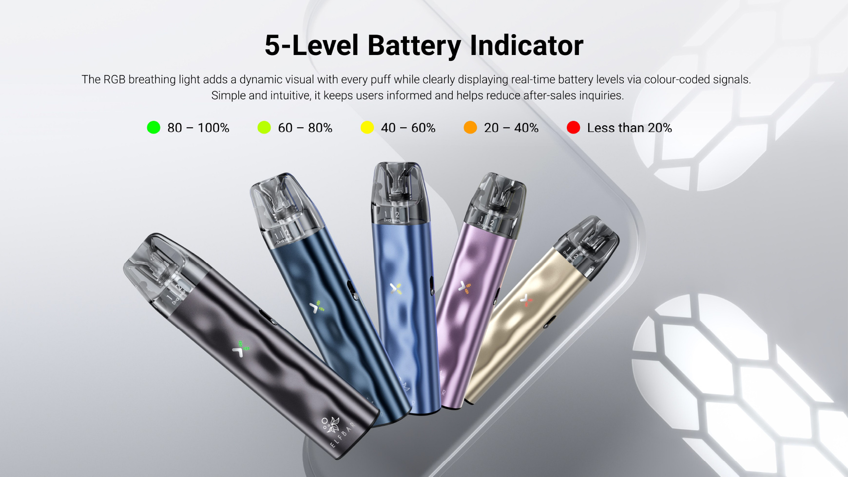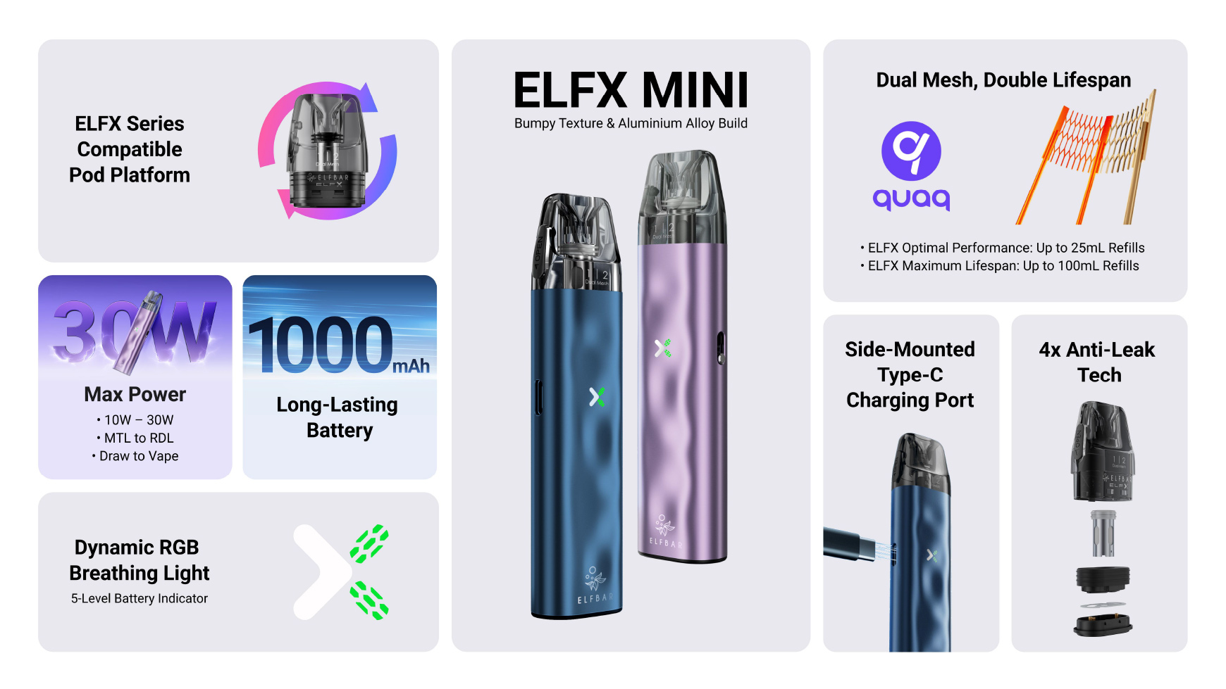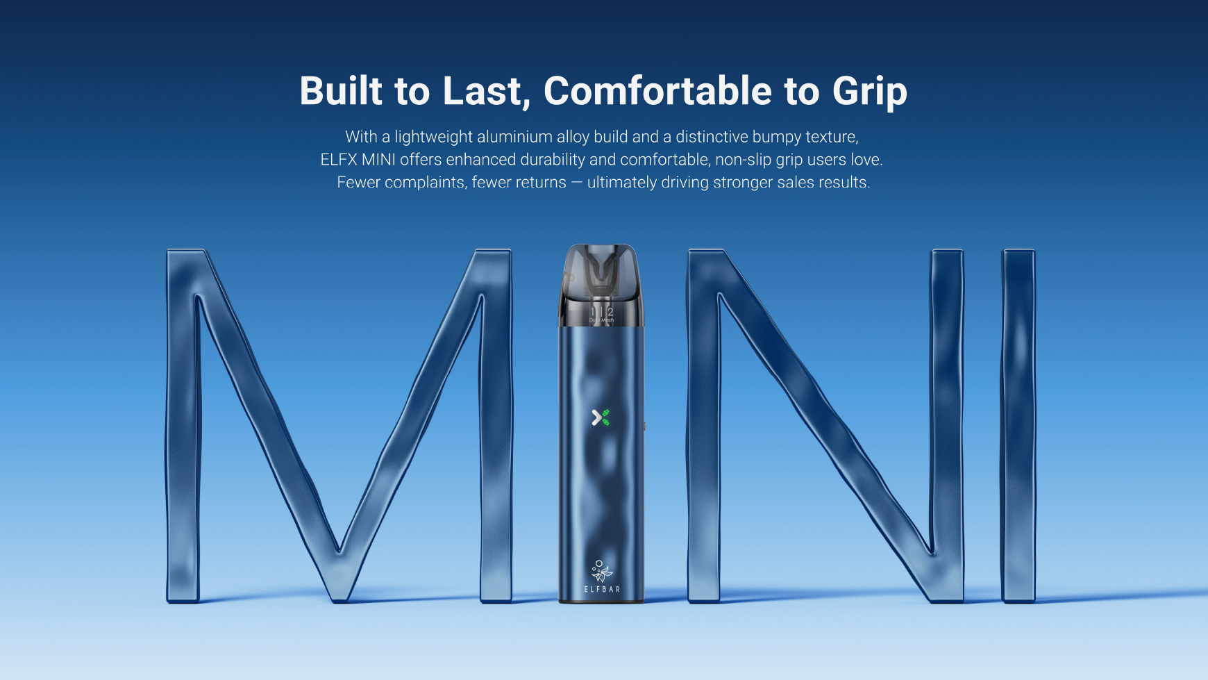Avec une structure légère en alliage d’aluminium et une texture bosselée distinctive, l’ELFX Mini offre une durabilité renforcée et une prise en main confortable et antidérapante, très appréciée des utilisateurs. Moins de plaintes, moins de retours — pour des résultats de vente nettement meilleurs.