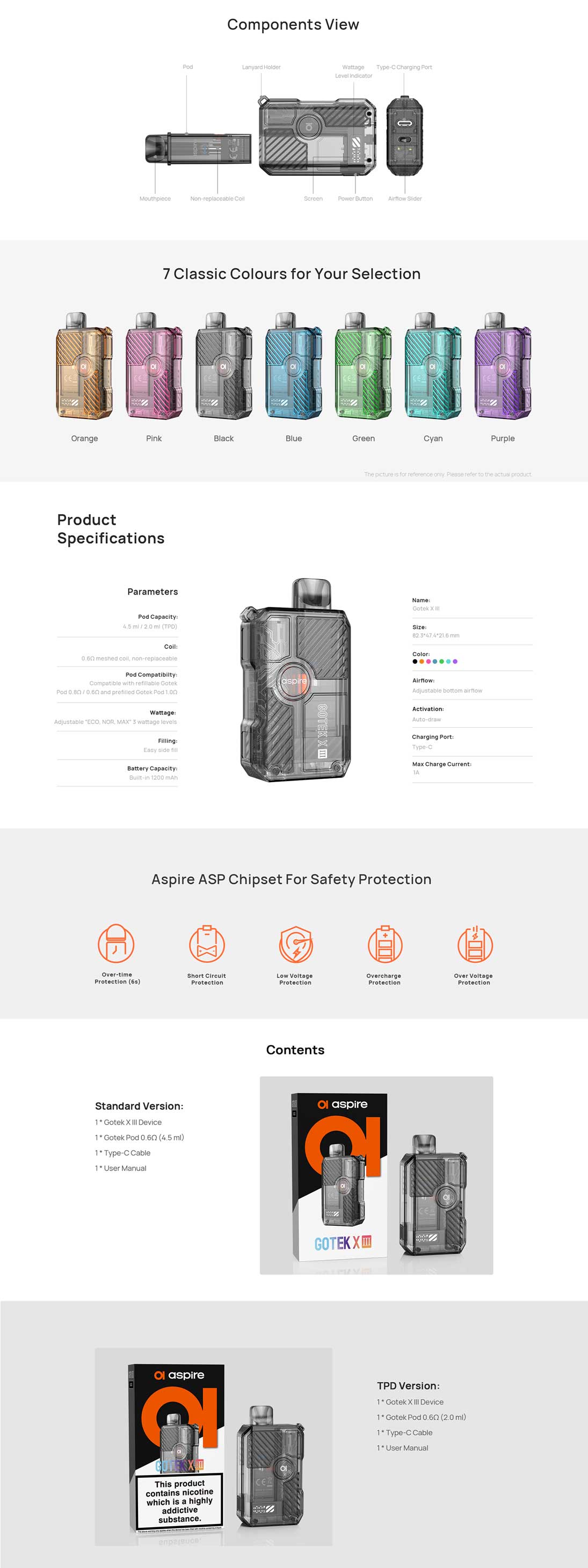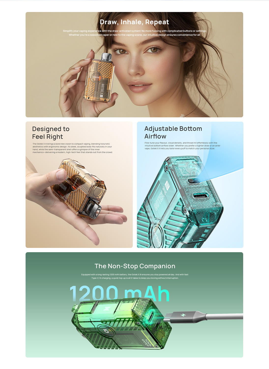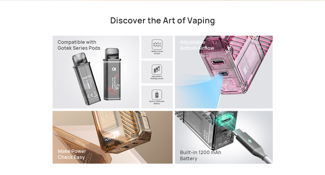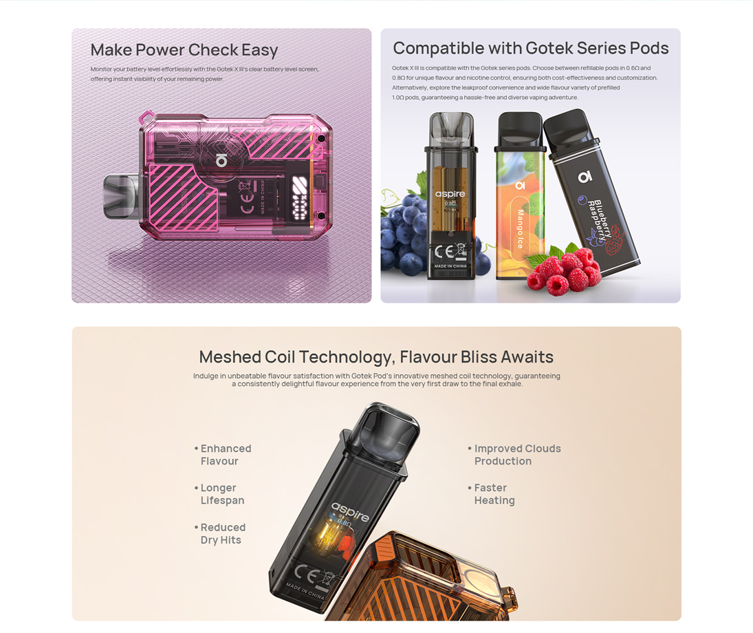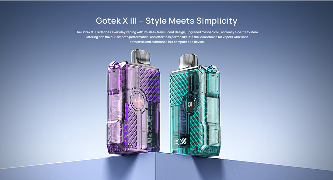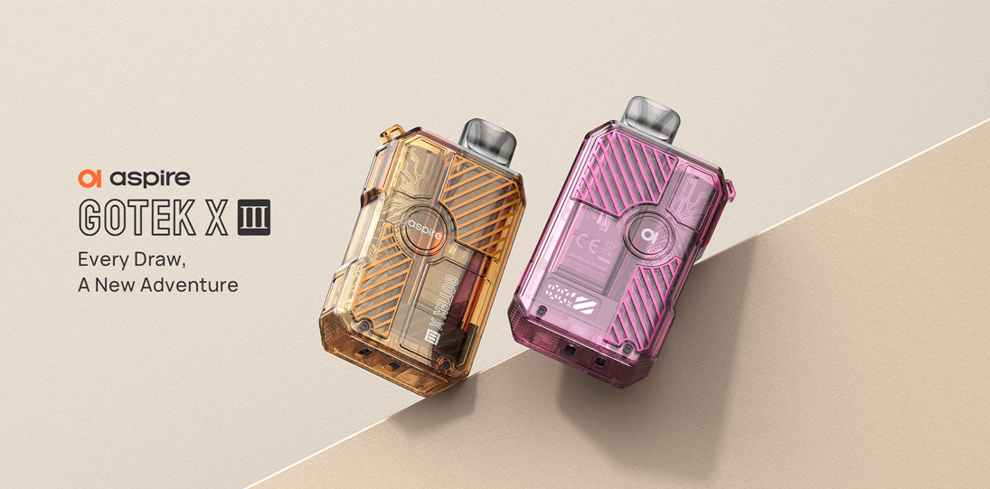 Le Gotek X-III d’Aspire est un pod compact (82,3×47,4×21,6 mm) doté d'une batterie intégrée de 1200 mAh, avec réglage de puissance sur 3 niveaux (ECO, NOR, MAX). Il utilise des cartouches Gotek (0.6Ω, 0.8Ω, 1.0Ω) avec remplissage latéral facile et airflow réglable. Activation automatique, port USB-C (1A), capacité de 4,5 ml.