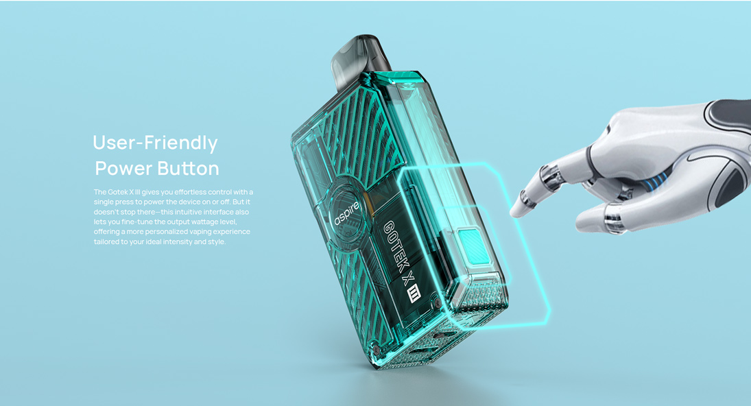 Le Gotek X-III vous offre un contrôle simple et efficace : une simple pression suffit pour allumer ou éteindre l’appareil. Mais ce n’est pas tout — cette interface intuitive vous permet également d’ajuster la puissance de sortie, pour une expérience de vape encore plus personnalisée, adaptée à votre intensité et à votre style idéal.