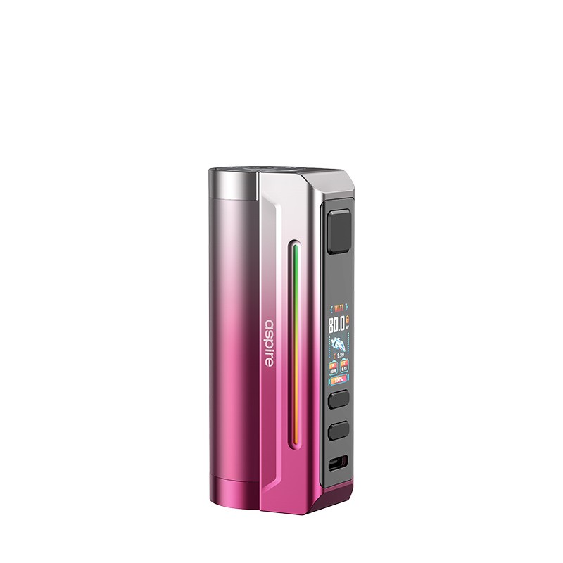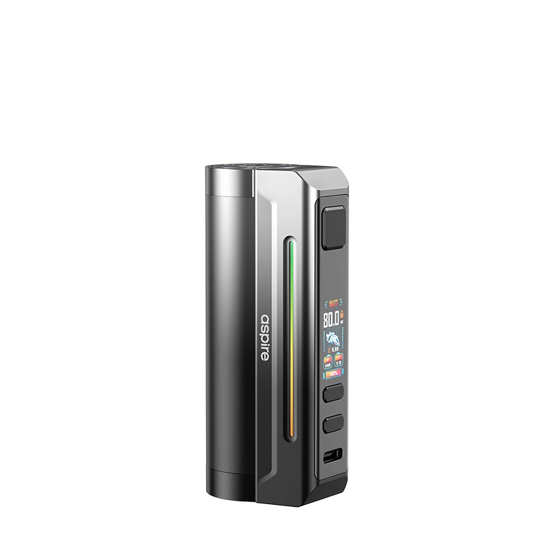 La box Aspire Zelos X80 offre jusqu’à 80W de puissance réglable avec 5 modes (VW, Bypass, TC, CPS, V). Il intègre un écran couleur TFT 0.96" et fonctionne avec un accu 18650 (non fourni).