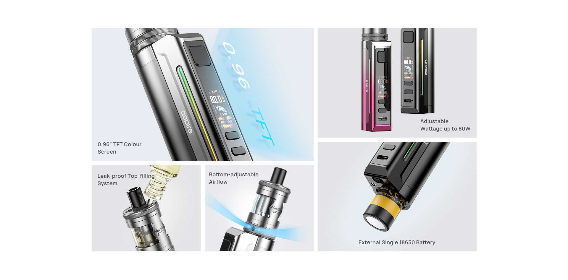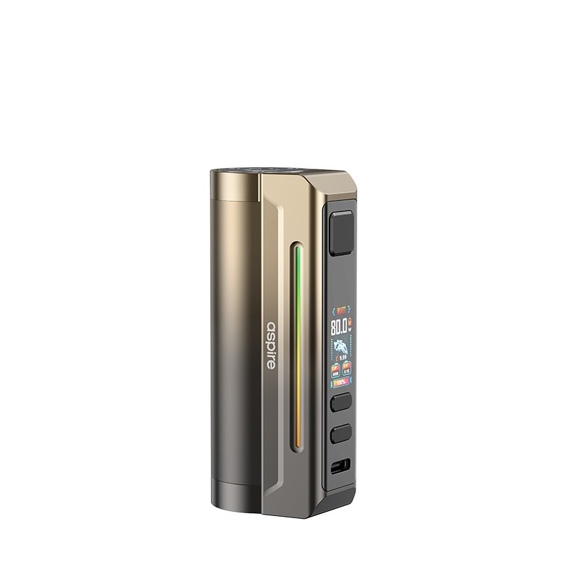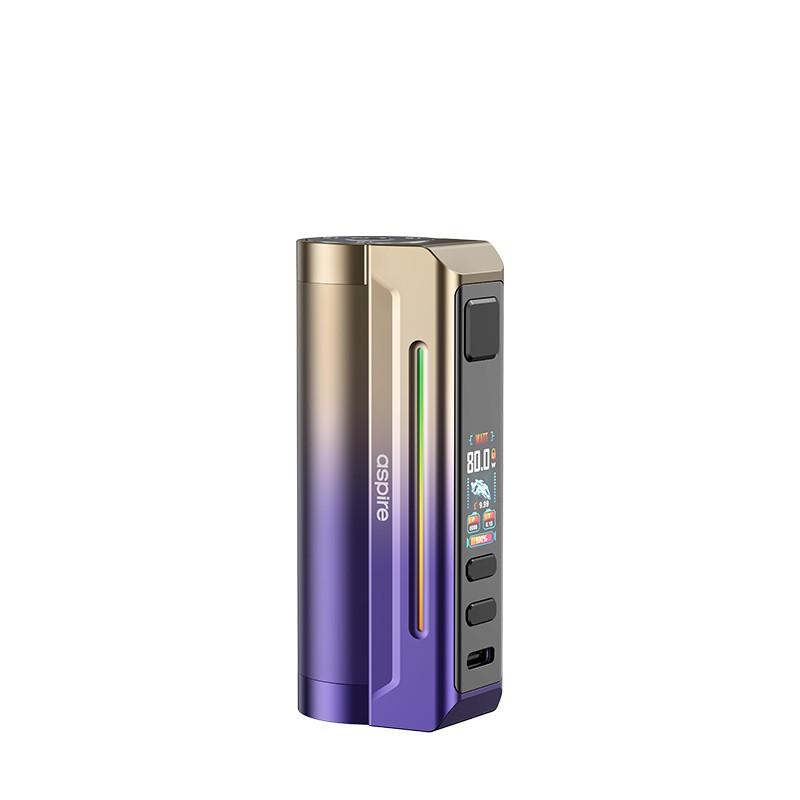 Le kit Aspire Zelos X80 offre jusqu’à 80W de puissance réglable avec 5 modes (VW, Bypass, TC, CPS, V). Il intègre un écran couleur TFT 0.96" et fonctionne avec un accu 18650 (non fourni)