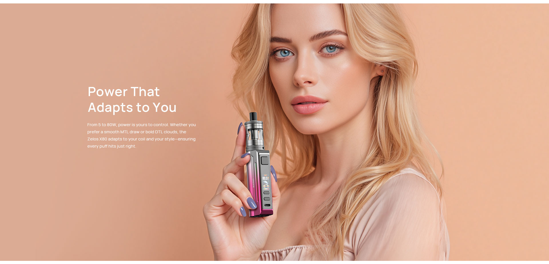 De 5 à 80 W, la puissance est entre vos mains. Que vous préfériez une inhalation MTL douce ou de généreux nuages en DTL, le Zelos X80 s’adapte à votre résistance et à votre style — pour que chaque bouffée soit parfaitement maîtrisée.