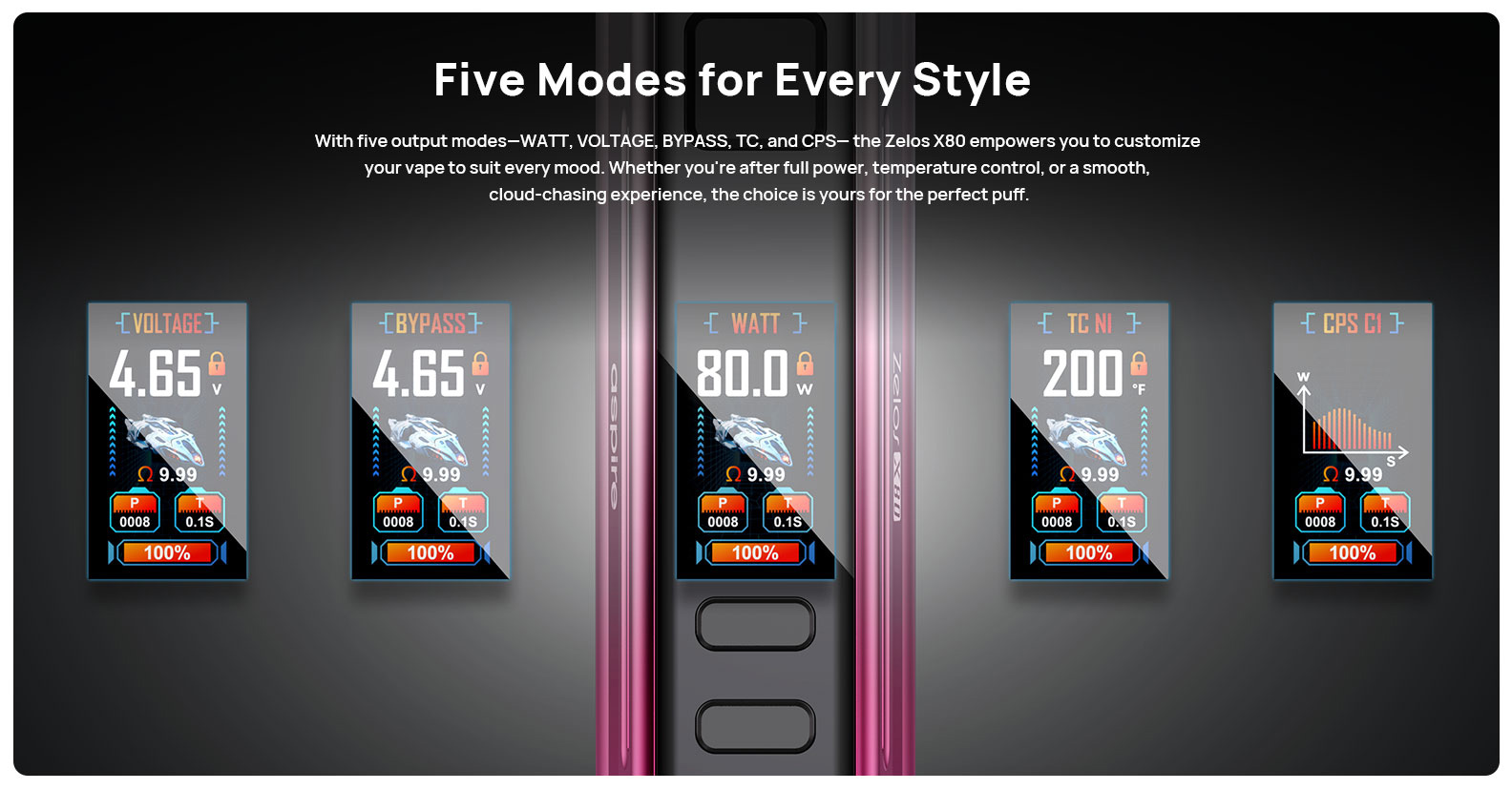 Avec cinq modes de sortie — WATT, VOLTAGE, BYPASS, TC et CPS — le Zelos X80 vous permet de personnaliser votre vape selon toutes vos envies. Que vous recherchiez une puissance maximale, un contrôle précis de la température ou une expérience douce et riche en vapeur, vous avez le choix pour une bouffée parfaite.
