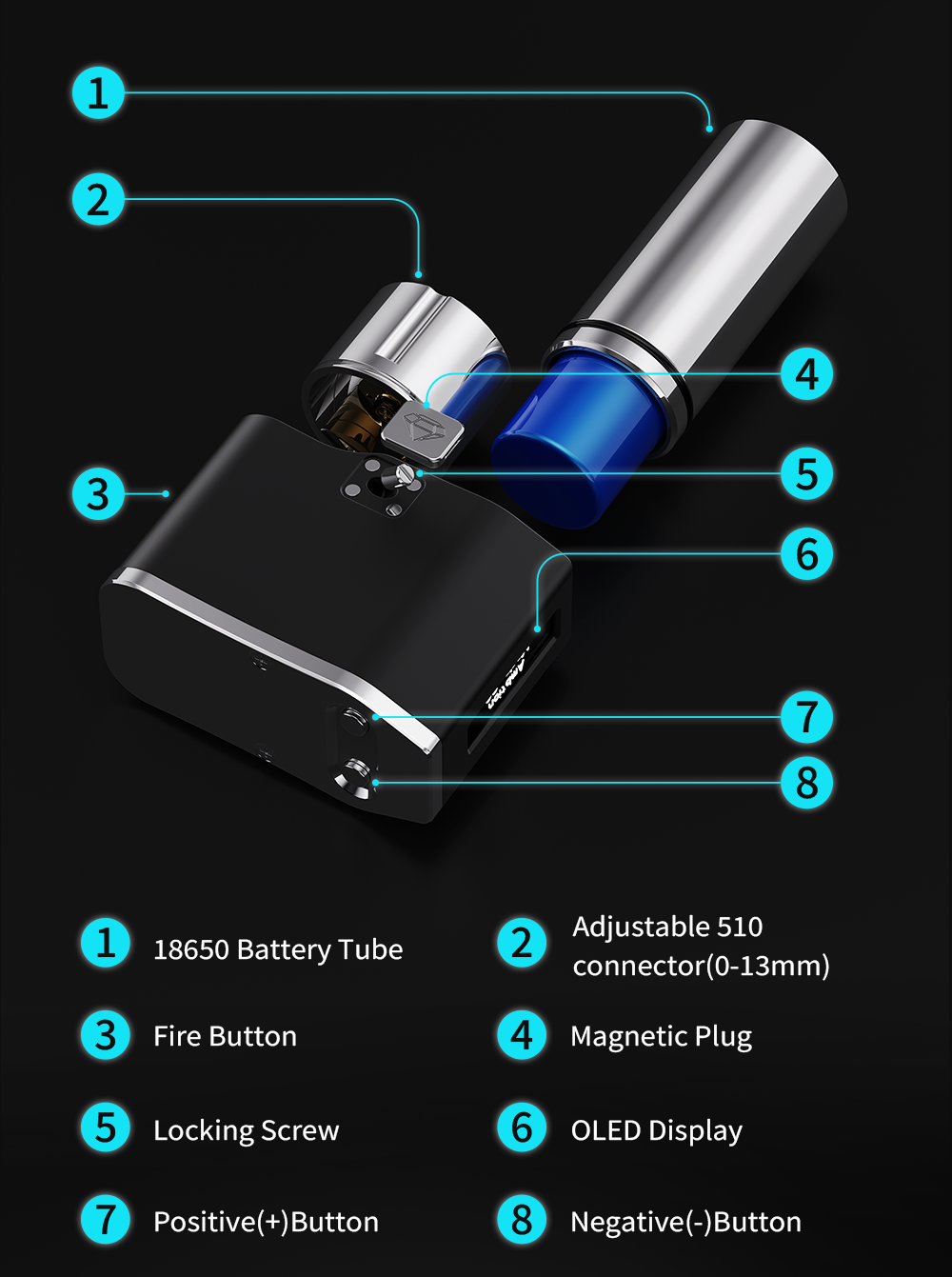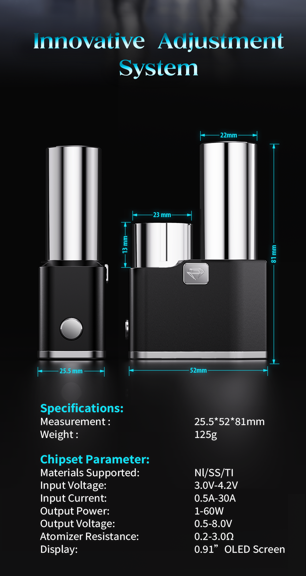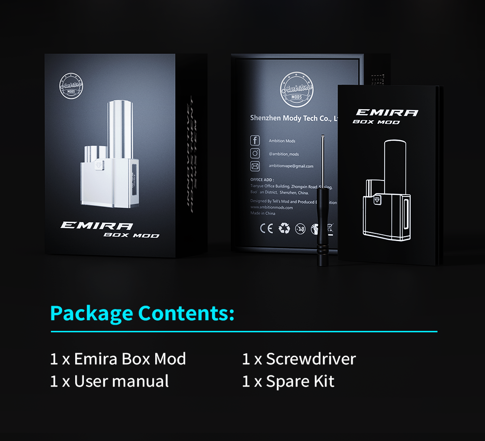 La Emira Box Mod permet d’ajuster la hauteur du connecteur 510 pour s’adapter à divers atomiseurs. Elle est compatible avec les accus 18650, 18500 et 18350 (tube 18650 inclus). Elle propose les modes puissance constante, contrôle de température (Ni, 316L, Ti), mode TC universel et mode méca simulé. Elle intègre aussi des protections complètes : inversion de polarité, surchauffe, courts-circuits, basse tension, etc.